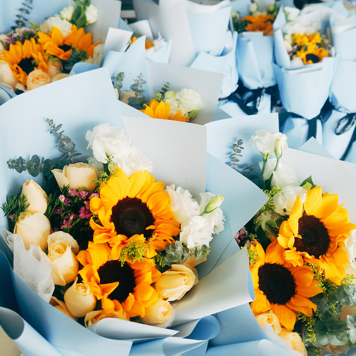 太陽(yáng)花花語(yǔ)是熱情、陽(yáng)光,能給人帶來(lái)美好希望;香檳玫瑰花語(yǔ)是長(zhǎng)久熱愛(ài)、鐘情一人;白桔?;ㄕZ(yǔ)是永恒的愛(ài)、真誠(chéng)的愛(ài);相思梅花語(yǔ)是對(duì)遠(yuǎn)方的思念。希望這一束象征美好與愛(ài)的花束能給公司所有女同事送去美好祝愿。